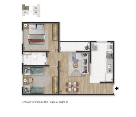 DIFERENCIAIS - Piso laminado de madeira na sala e nos quartos e cerâmica nas áreas molhadas, Tomada USB na sala, Janelas dos quartos em veneziana, Banheiro revestido até o teto, Bacia sanitária com duplo acionamento, Bancada da cozinha em granito com cuba em inox, Torneiras com arejador e redutor de vazão, Área de serviço com tanque em mármore sintético, Varanda, Preparação para ar-condicionado nos quartos.
