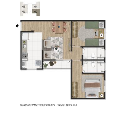 Este apartamento de 2 dormitórios, sendo 1 suíte, oferece um layout inteligente com sala para 2 ambientes, varanda integrada, cozinha espaçosa e banheiro social. Com 1 vaga de garagem, é perfeito para quem busca conforto e praticidade em um único lugar.