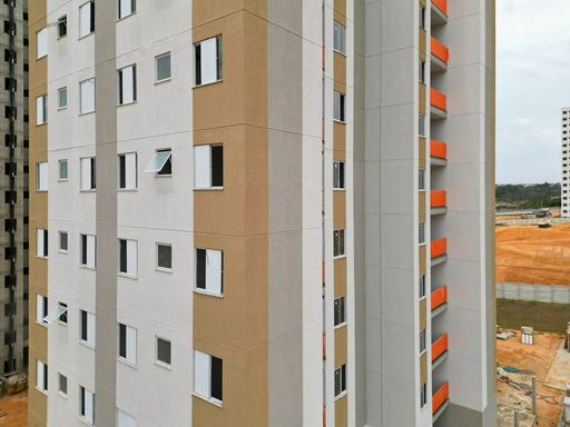 DIFERENCIAIS - Piso laminado de madeira na sala e nos quartos e cerâmica nas áreas molhadas, Tomada USB na sala, Janelas dos quartos em veneziana, Banheiro revestido até o teto, Bacia sanitária com duplo acionamento, Bancada da cozinha em granito com cuba em inox, Torneiras com arejador e redutor de vazão, Área de serviço com tanque em mármore sintético, Varanda, Preparação para ar-condicionado nos quartos.