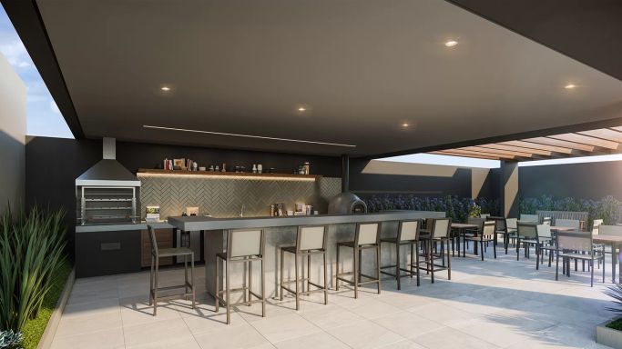 Terraço gourmet amplo, com ponto para churrasqueira a gás ou elétrica