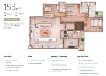 Com 153 m² de área útil, cada unidade oferece 3 suítes (incluindo suíte master com terraço), 3 vagas determinadas, um living integrado à varanda gourmet com churrasqueira a carvão e exaustor, garantindo conforto e elegância para o dia a dia e para receber com sofisticação.