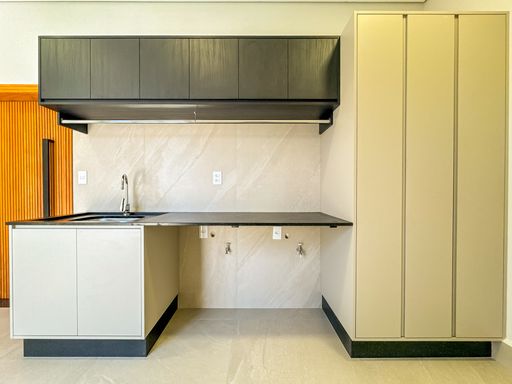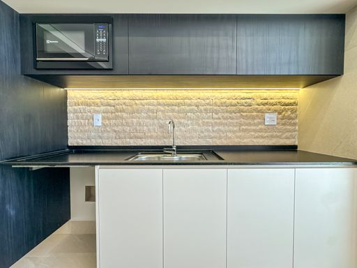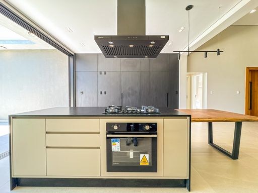 Cozinha equipada com cooktop, forno, micro-ondas e coifa