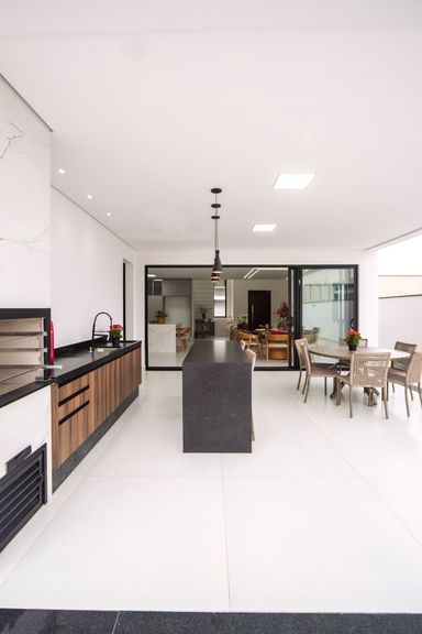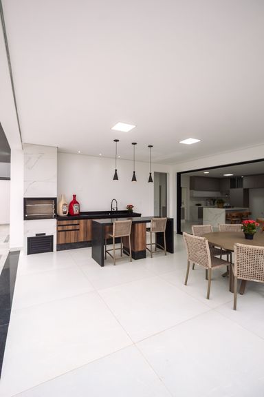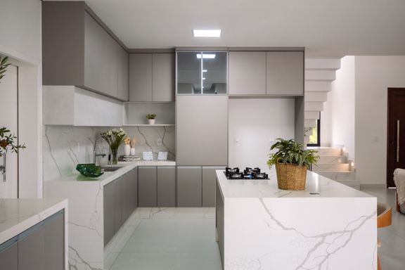 🔹 Bancadas, ilha, churrasqueira e escadas em porcelanato Calacata