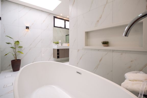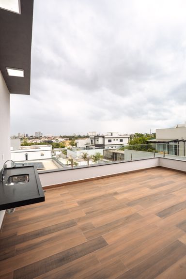 ✔ Suíte master com banheira, pia dupla, chuveiro duplo, claraboia e ampla varanda com vista permanente